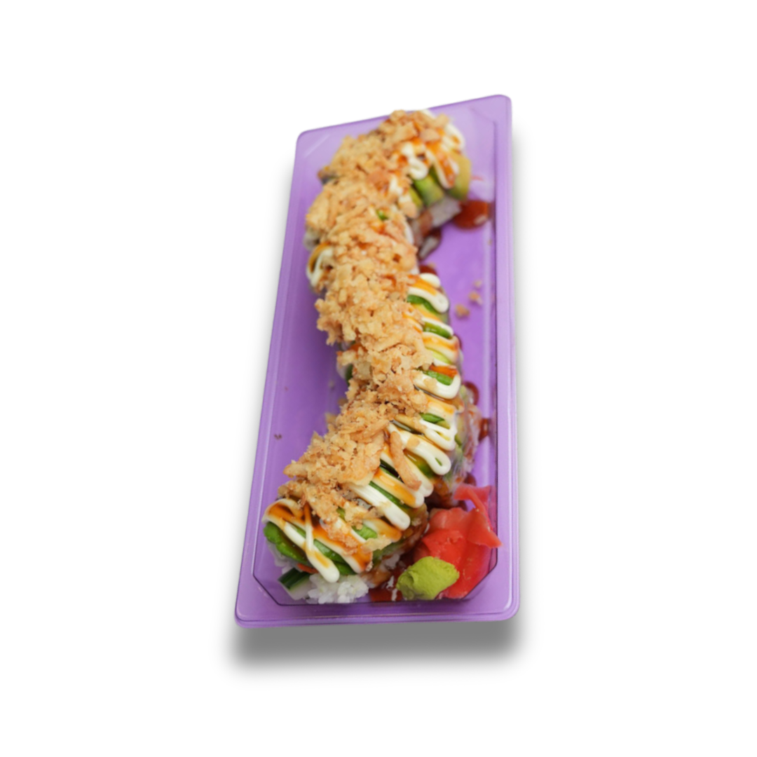 Veggie roll on top avocado, mayonnaise, teriyaki and crispy onion.