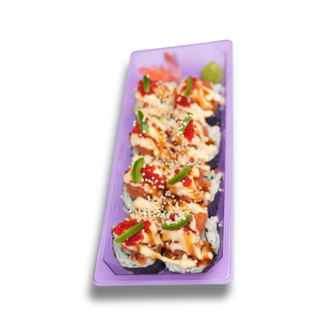 California roll nori outside, on top spicy tuna, teriyaki, spicy mayo, red tobiko, jalapeño and rice pearl.
